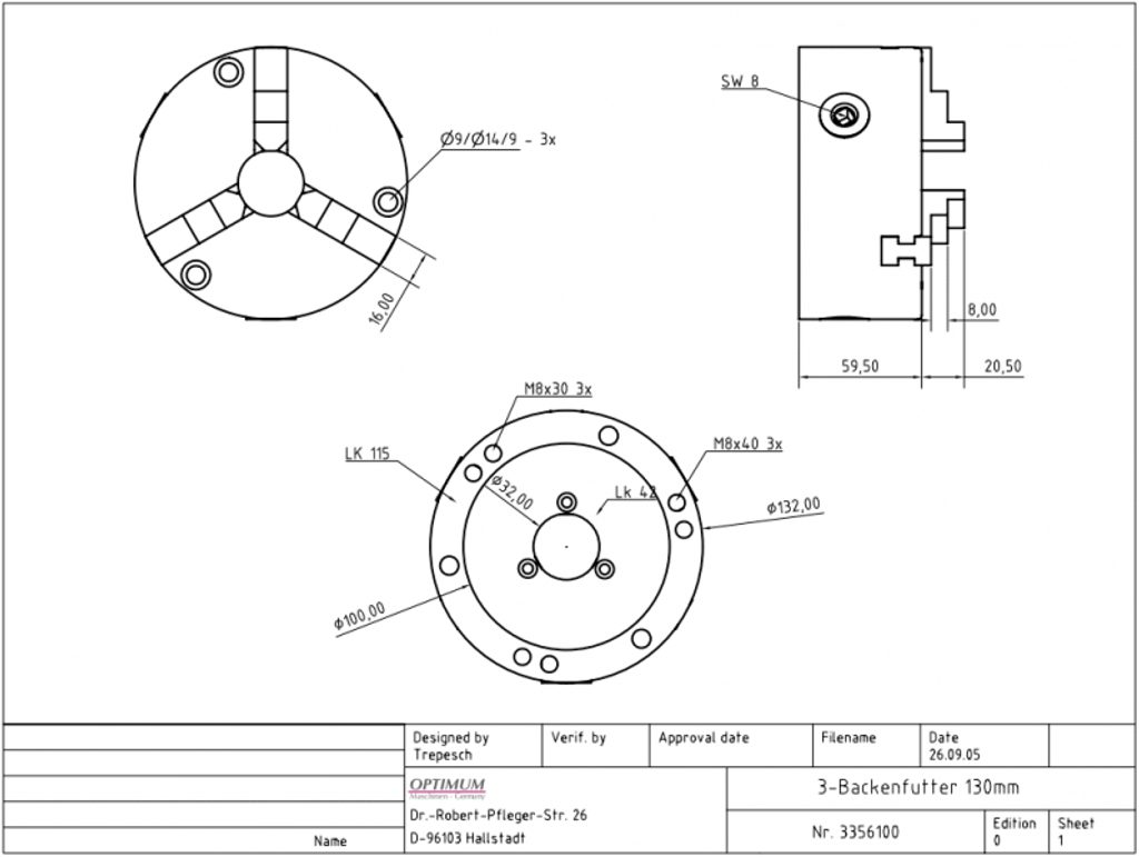 Tříčelisťové sklíčidlo průměru 125 mm určené pro horizontálně-vertikální kruhový dělicí stůl RT 150 (obj.č. 3356150).