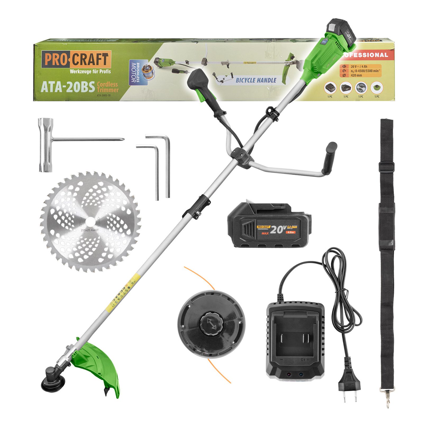 Aku křovinořez Procraft ATA-20BS je určen k sečení a vyžínání travnatých ploch, k odstranění plevelů. Silný bezuhlíkový motor s otáčkami až 5500 zaručuje dlouhou bezporuchovou práci. Možnost plynulé regulace otaček sečení v závislosti na hustotě a síle porostu a požadavku na přesnost práce. Součástí balení: baterie 20V 4Ah, nabíječka, pilový kotouč, strunová hlava s průměrem struny 2,4mm a montážní klíč. Pracovní záběr (mm) 420. Otáčky, /min: 0-4500/5500.