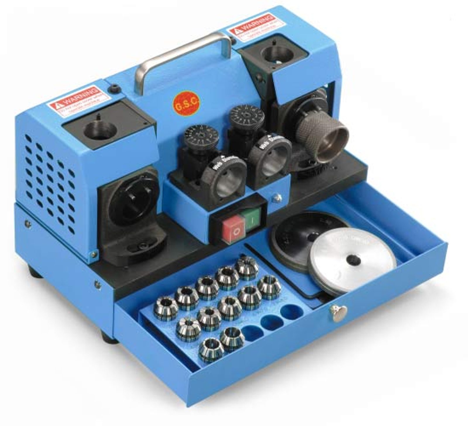 Bruska pro spirálové vrtáky ø 2 – 13 mm. Úhel broušení 90 – 140°. Pro vrtáky do plechu ø 3 – 13 mm. Úhel broušení 165 – 180°.
