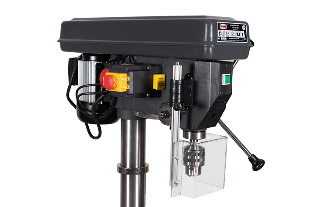 Stojanová vrtačka E-1516B/400, stroj táto třídy vyniká řadou nadstandardních funkcí a možnostmi, které uživatelům přinášejí vysokou užitnou hodnotu. Je konstruován pro vrtání, zahlubování a vystružování. Vhodné využití najde v zámečnických dílnách, opravárenských podnicích, truhlárnách, skladech ale i u domácích kutilů. Vřeteno je uloženo v kuličkových ložiscích a osazena kuželem Mk II, do kterého je možné vložit vrtací sklíčidlo nebo přímo nástroj. Pracovní stůl lze natáčet až o 360° pomocí otočného čepu a naklápět do úhlu + / - 45° od základní roviny, což umožňuje vrtání otvorů pod různými úhly.
