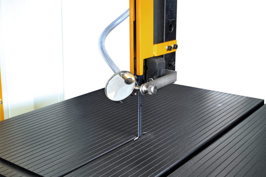 Vertikální pásová pila na kov s robustní konstrukcí a svařovací jednotkou pásu.