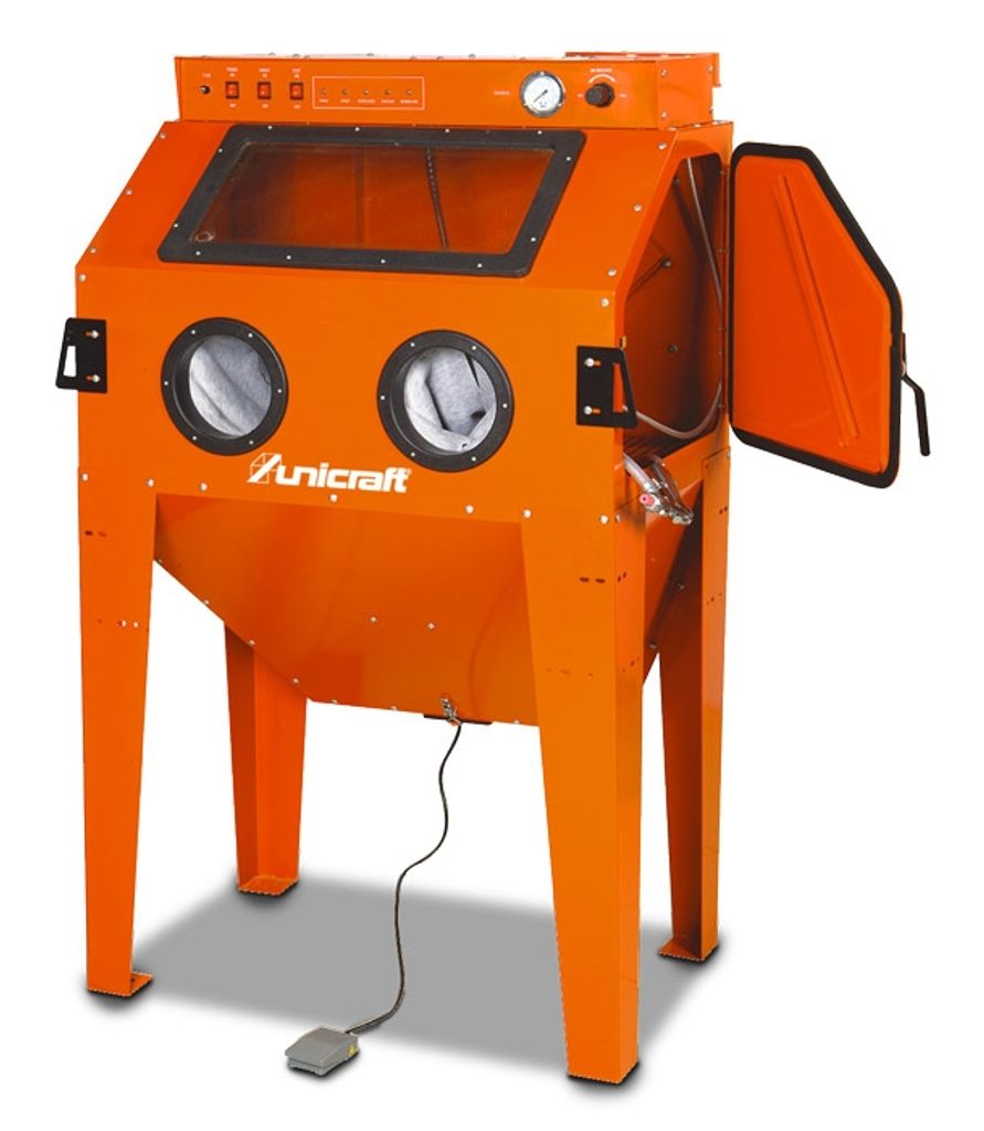 Samostatně stojící box s aktivním odsáváním pro pískování středně velkých předmětů. Vhodný např. k zdrsnění, vyhlazení, k renovacím zašlých povrchů, odstranění rzi, okují, barvy apod.