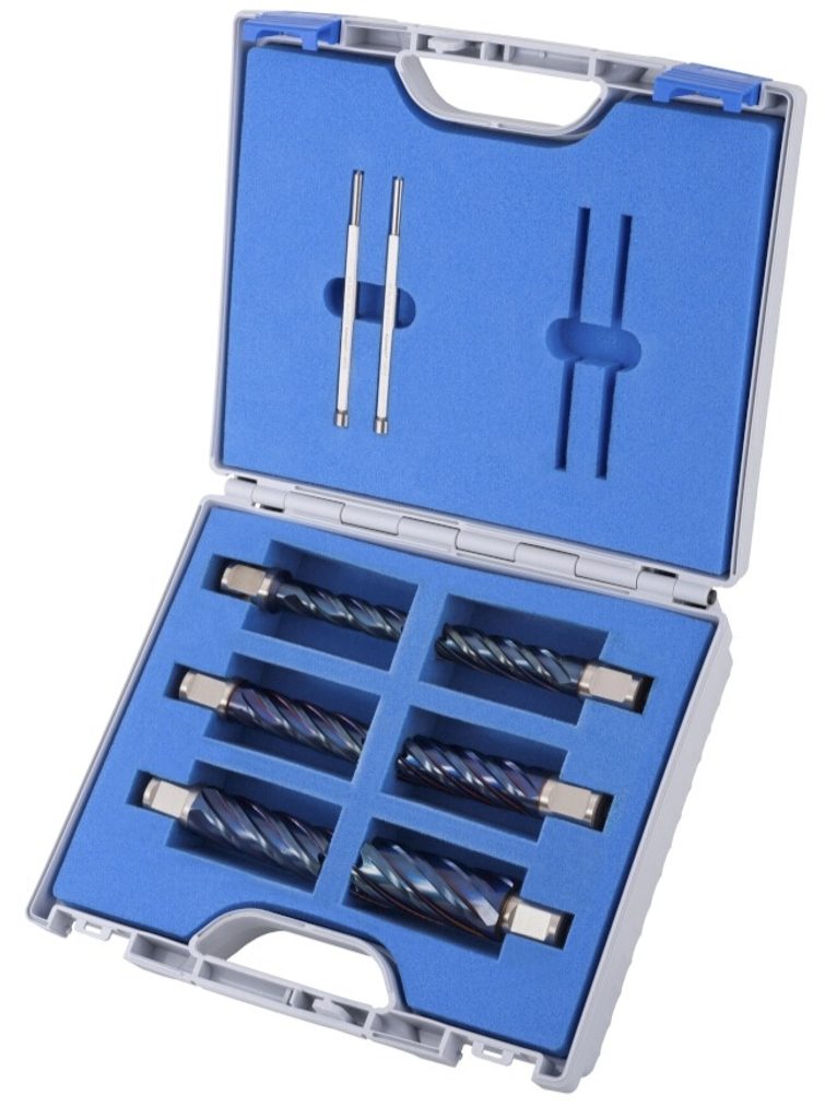 Sada šesti špičkových vrtáků a dvou středících kolíků řady Karnasch BLUE-LINE 55 v praktickém kufru.