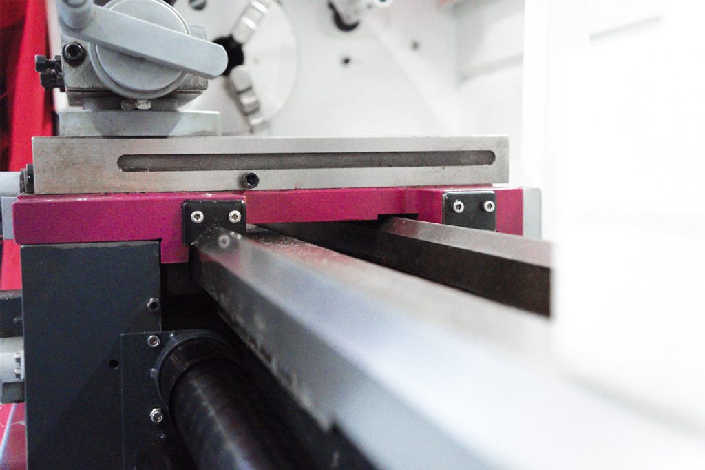 Soustruh s vodícím a tažným šroubem, podélným i příčným posuvem.