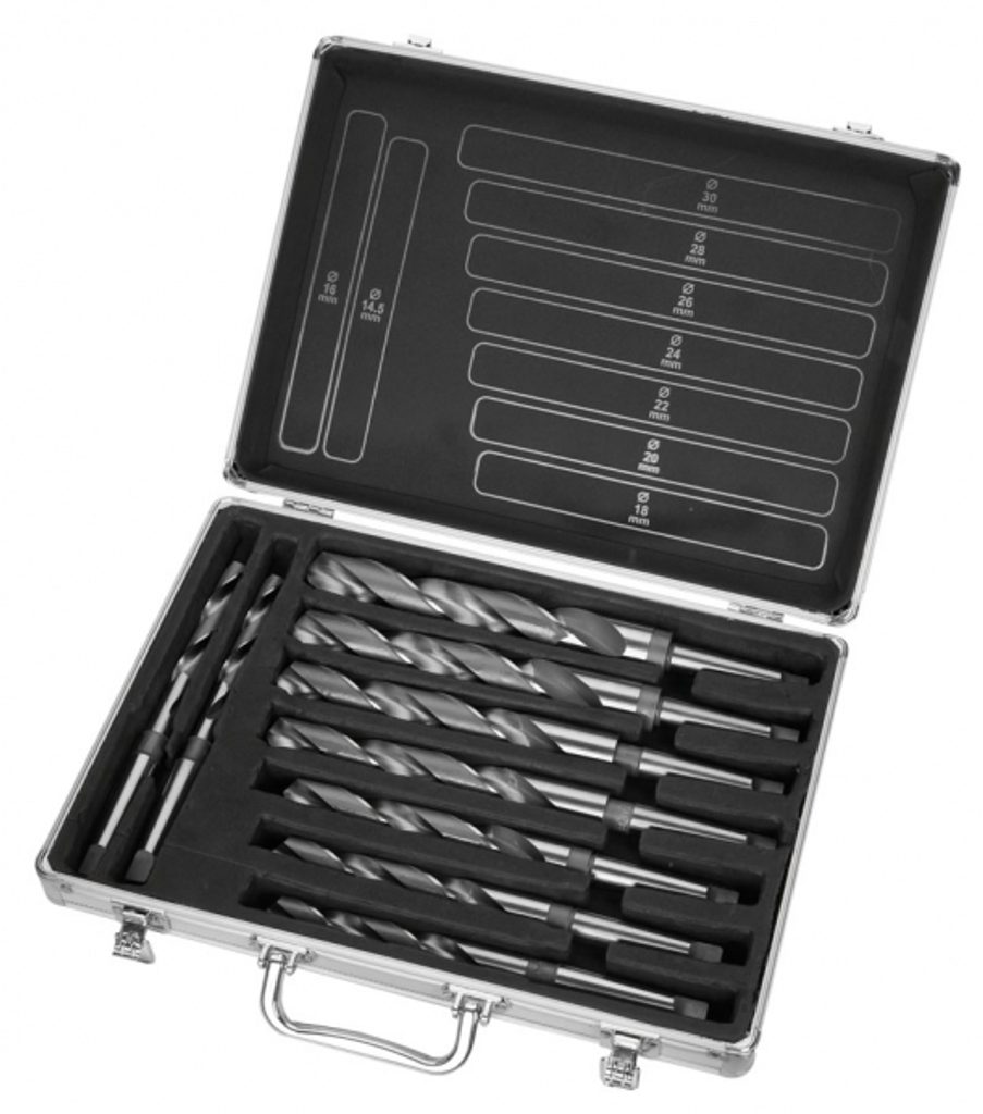 Sada 9 kusů vrtáků v průměrech 14,5/16/18/20/22/24/26/28/30 mm, v kovovém kufříku.